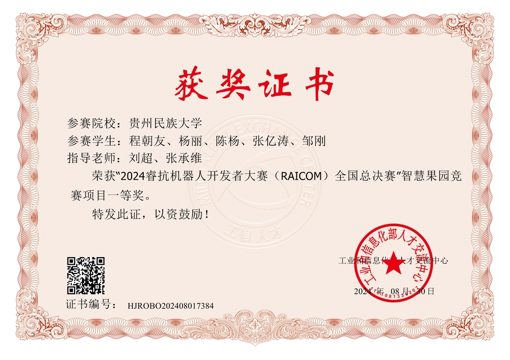 教师刘超、张承维指导的学生团队在赛项中以较高的水平完成果实分拣、抓取和运输任务,以技术总分排名第一的成绩夺得“智慧果园”赛项全国总冠军。