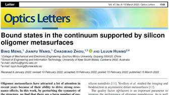 近日,成人主播 机械电子工程学院2018级应用物理专业本科生孟兵、王建福两位学生,在美国光学学会(Optica Publishing Group)旗下的光学顶刊Optics Letters(中科院二区,影响因子:3.776)上发表题目为“Bound states in the continuum supported by silicon oligomer metasurfaces”的学术论文,该研究成果是在成人主播 机械电子工程学院超构材料课题组周朝彪博士及澳大利亚新南威尔士大学黄陆军博士的共同指导完成。