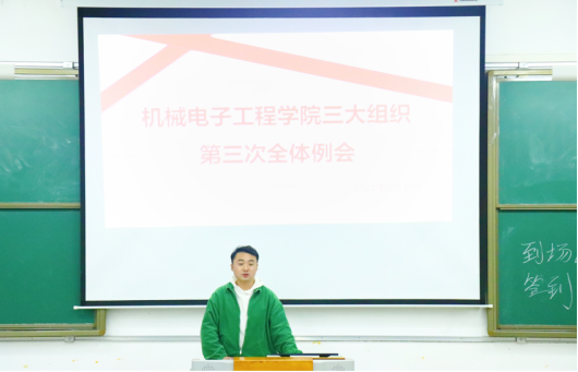 温暖的春天已经渐渐离我们远去,汗水也在明媚的阳光下出现在我们的额头。经过日夜的奋斗,在临近期末之际,机械电子工程学院三大组织于5月19日晚19:00在教一负107开展本学期第三次全体例会。出席本次例会的有机械电子工程学院团委负责人赵洪,学生会主席团成员潘秋红、张游、唐彬,分团委副书记石正发、青年志愿者协会会长黄松、副会长吴正杰以及三大组织所有成员,本次例会由赵洪主持。